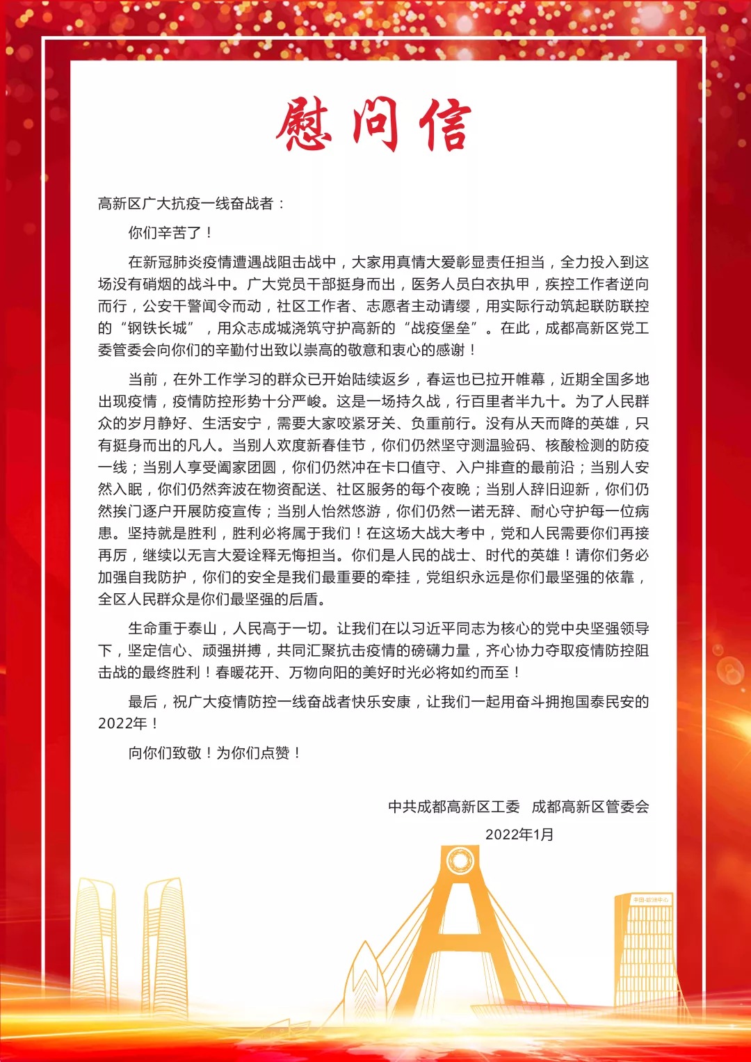 致成都高新區(qū)廣大抗疫一線(xiàn)奮戰(zhàn)者的一封信