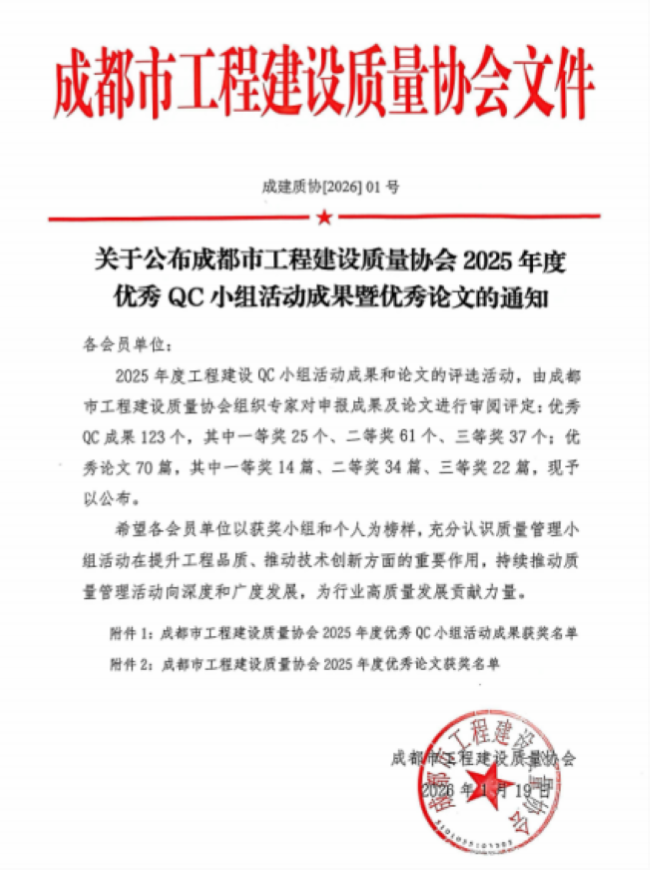 1月19日,成都市2025年度優(yōu)秀QC小組活動(dòng)成果暨優(yōu)秀論文評(píng)選結(jié)果出爐,高新發(fā)展下屬成都倍特建筑安裝工程有限公司(以下簡稱倍特建安)3項(xiàng)QC成果榮獲一等獎(jiǎng)1項(xiàng),二等獎(jiǎng)2項(xiàng)。瀏覽 : 1031分享